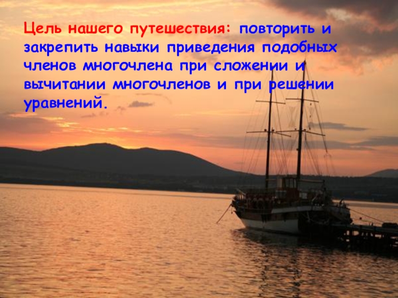 Цель нашего путешествия: повторить и закрепить навыки приведения подобных членов многочлена при сложении и вычитании многочленов и при решении уравнений.