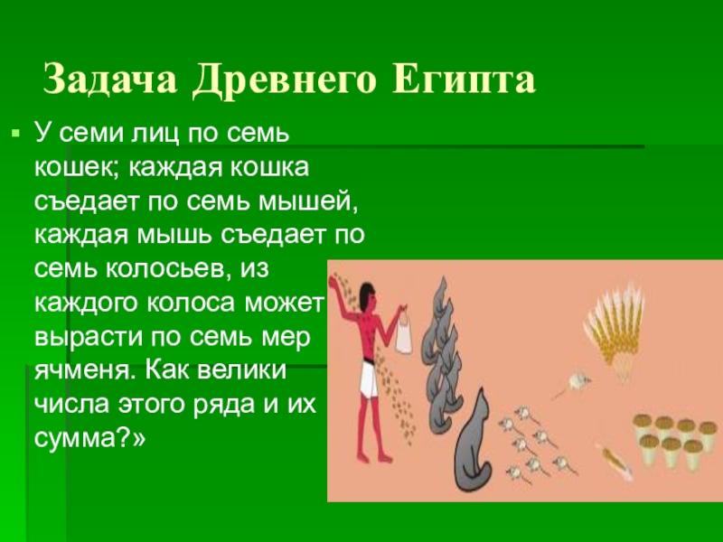 Задача Древнего ЕгиптаУ семи лиц по семь кошек; каждая кошка съедает по семь мышей, каждая мышь съедает