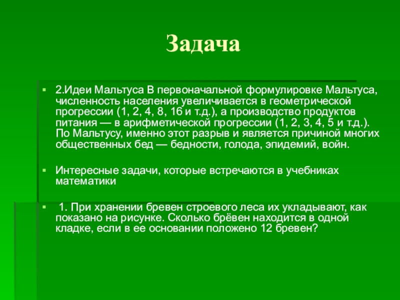 2.Идеи Мальтуса В первоначальной формулировке Мальтуса, численность населения увеличивается в геометрической