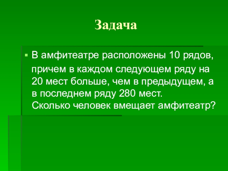 ЗадачаВ амфитеатре расположены 10 рядов,  причем в каждом следующем ряду на 20 мест больше, чем в
