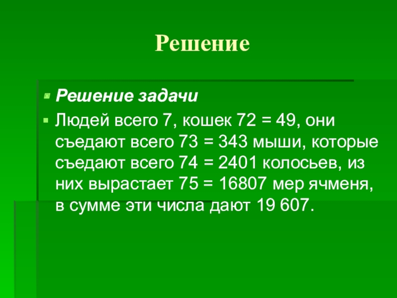 Решение Решение задачиЛюдей всего 7, кошек 72 = 49, они съедают всего 73 = 343 мыши, которые