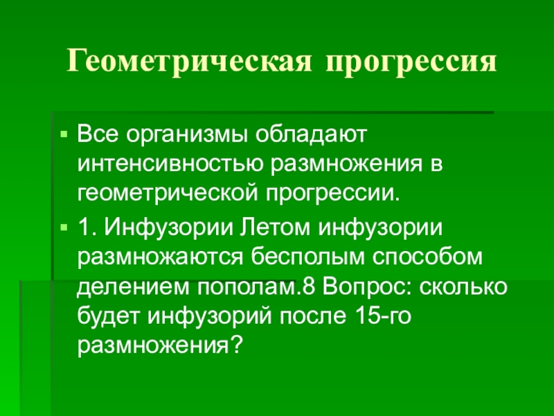 Геометрическая прогрессияВсе организмы обладают интенсивностью размножения в геометрической прогрессии. 1. Инфузории Летом инфузории размножаются бесполым способом делением