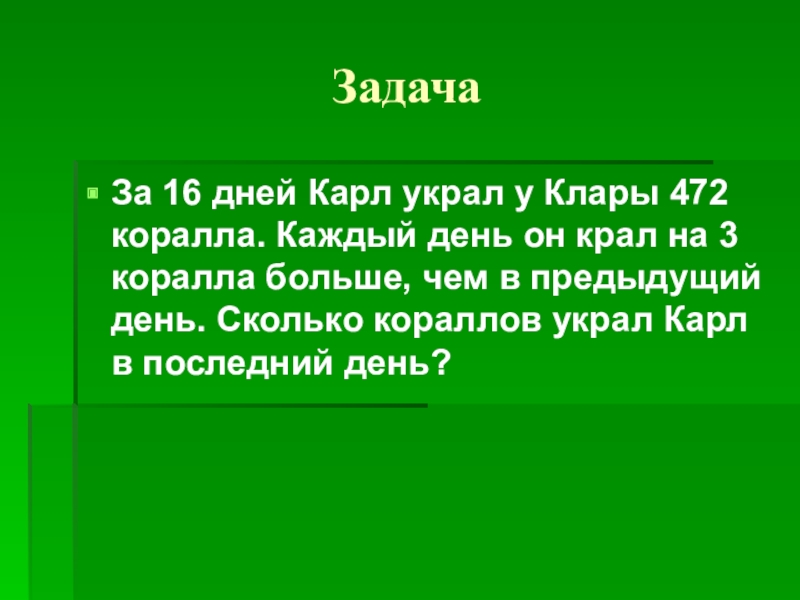 ЗадачаЗа 16 дней Карл украл у Клары 472 коралла. Каждый день он крал на 3 коралла больше,