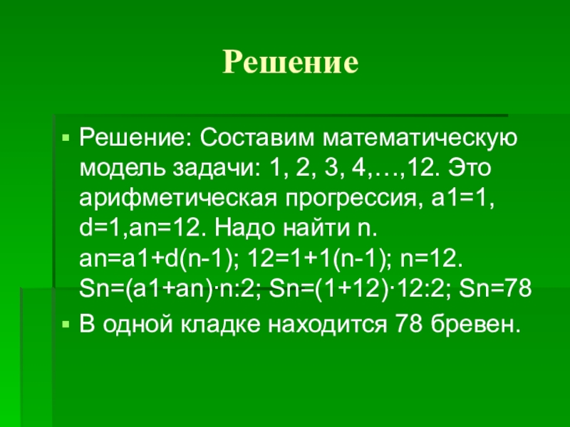 РешениеРешение: Составим математическую модель задачи: 1, 2, 3, 4,…,12. Это арифметическая прогрессия, а1=1, d=1,аn=12. Надо найти n.