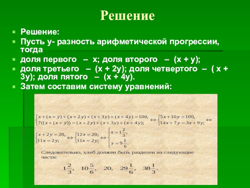 РешениеРешение:Пусть у- разность арифметической прогрессии, тогдадоля первого   –  х; доля второго   –  (х + у);доля третьего   –
