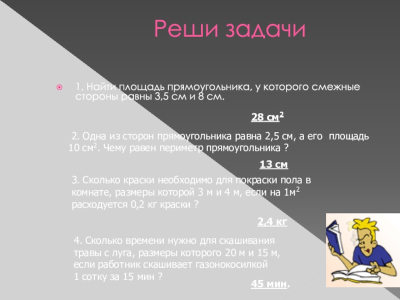 2. Одна из сторон прямоугольника равна 2,5 см, а его площадь 10 см2. Чему равен периметр прямоугольника ?