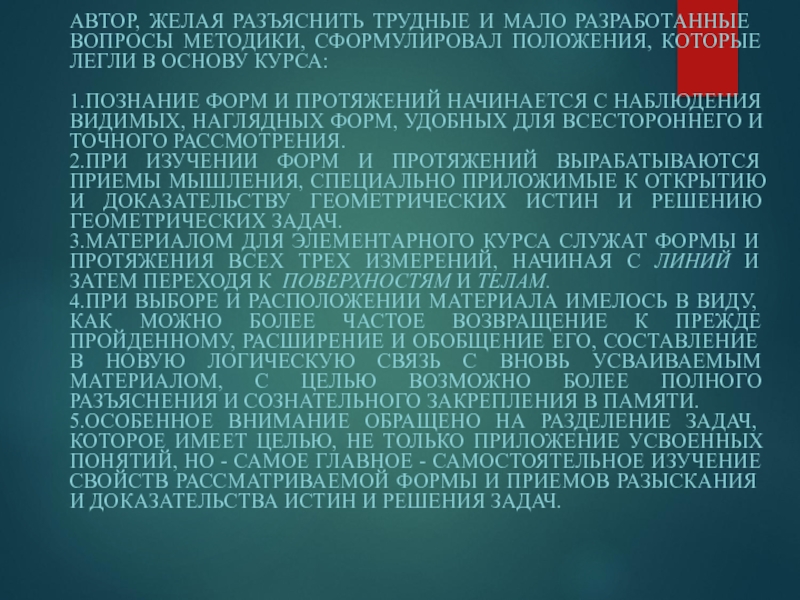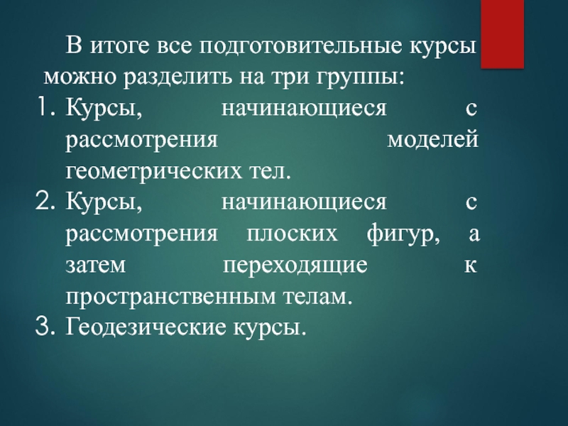 БОЛЬШОЕ КОЛИЧЕСТВО ОРИГИНАЛЬНЫХ ПОДГОТОВИТЕЛЬНЫХ КУРСОВ ГЕОМЕТРИИ. СУЩЕСТВОВАЛО МНЕНИЕ, ЧТО СОЗДАВ У УЧАЩИХСЯ БАЗУ В ВИДЕ ЦЕЛОГО РЯДА ПРЕДСТАВЛЕНИЙ, МОЖНО ЗАТЕМ ПЕРЕЙТИ К ИЗУЧЕНИЮ ДЕДУКТИВНЫМ СПОСОБОМ СИСТЕМАТИЧЕСКОГО КУРСА ГЕОМЕТРИИ.