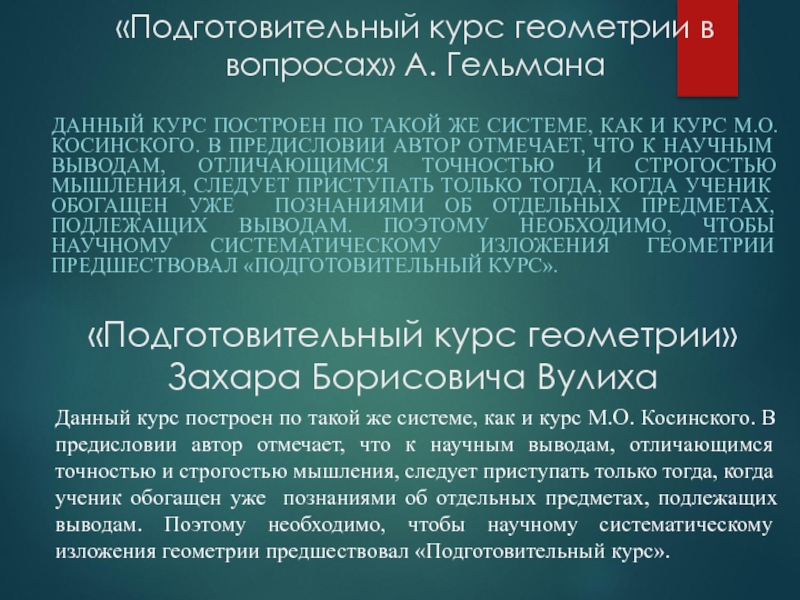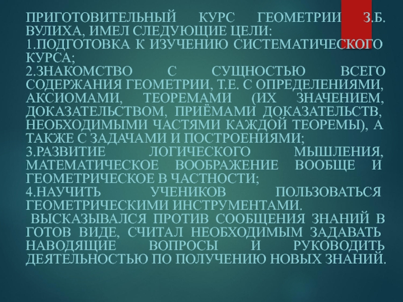 Слайд 11ПРИГОТОВИТЕЛЬНЫЙ КУРС ГЕОМЕТРИИ З.Б. ВУЛИХА, ИМЕЛ СЛЕДУЮЩИЕ ЦЕЛИ: