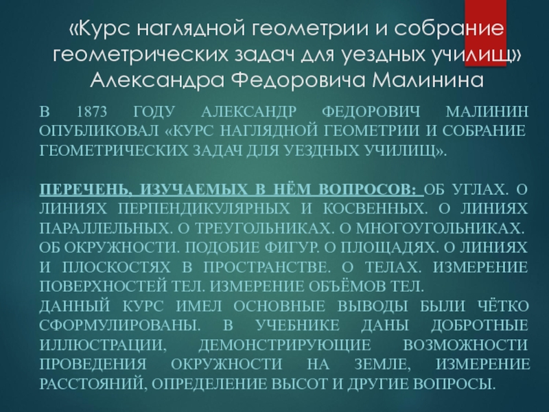 В 1873 ГОДУ АЛЕКСАНДР ФЕДОРОВИЧ МАЛИНИН ОПУБЛИКОВАЛ «КУРС НАГЛЯДНОЙ ГЕОМЕТРИИ И СОБРАНИЕ ГЕОМЕТРИЧЕСКИХ ЗАДАЧ ДЛЯ УЕЗДНЫХ УЧИЛИЩ».