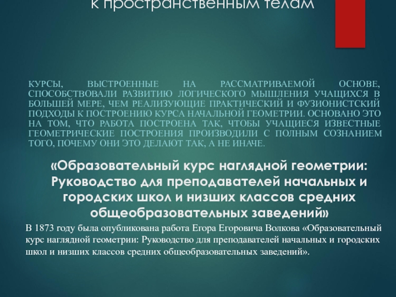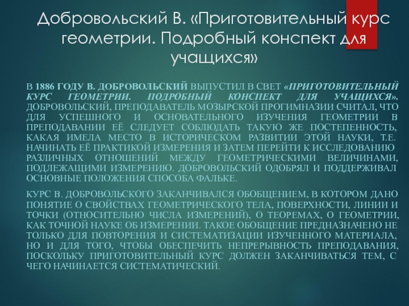 ГОДУ В. ДОБРОВОЛЬСКИЙ ВЫПУСТИЛ В СВЕТ «ПРИГОТОВИТЕЛЬНЫЙ КУРС ГЕОМЕТРИИ. ПОДРОБНЫЙ КОНСПЕКТ ДЛЯ УЧАЩИХСЯ». ДОБРОВОЛЬСКИЙ, ПРЕПОДАВАТЕЛЬ МОЗЫРСКОЙ ПРОГИМНАЗИИ СЧИТАЛ, ЧТО ДЛЯ УСПЕШНОГО И ОСНОВАТЕЛЬНОГО ИЗУЧЕНИЯ ГЕОМЕТРИИ В ПРЕПОДАВАНИИ ЕЁ СЛЕДУЕТ СОБЛЮДАТЬ ТАКУЮ ЖЕ ПОСТЕПЕННОСТЬ, КАКАЯ ИМЕЛА МЕСТО В ИСТОРИЧЕСКОМ РАЗВИТИИ ЭТОЙ НАУКИ, Т.Е. НАЧИНАТЬ ЕЁ ПРАКТИКОЙ ИЗМЕРЕНИЯ И ЗАТЕМ ПЕРЕЙТИ К ИССЛЕДОВАНИЮ РАЗЛИЧНЫХ ОТНОШЕНИЙ МЕЖДУ ГЕОМЕТРИЧЕСКИМИ ВЕЛИЧИНАМИ, ПОДЛЕЖАЩИМИ ИЗМЕРЕНИЮ. ДОБРОВОЛЬСКИЙ ОДОБРЯЛ И ПОДДЕРЖИВАЛ ОСНОВНЫЕ ПОЛОЖЕНИЯ СПОСОБА ФАЛЬКЕ.