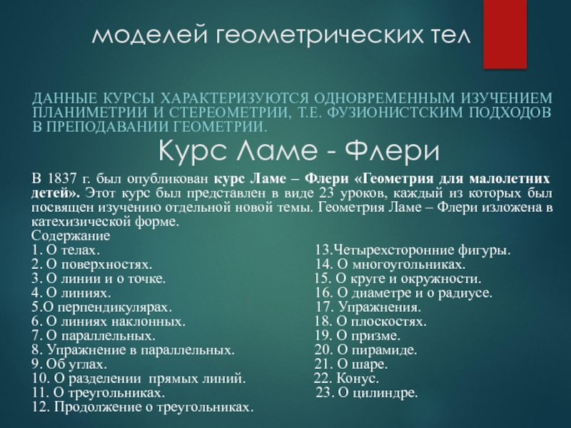 В 1837 г. был опубликован курс Ламе – Флери «Геометрия для малолетних детей». Этот курс был представлен в виде 23 уроков, каждый из которых был посвящен изучению отдельной новой темы. Геометрия Ламе – Флери изложена в катехизической форме.