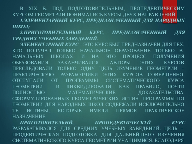 Слайд 2В XIX В. ПОД ПОДГОТОВИТЕЛЬНЫМ, ПРОПЕДЕВТИЧЕСКИМ КУРСОМ ГЕОМЕТРИИ ПОНИМАЛИСЬ КУРСЫ ДВУХ
