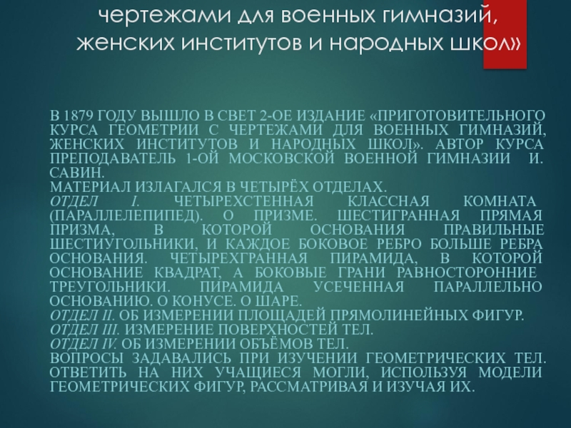 В 1879 ГОДУ ВЫШЛО В СВЕТ 2-ОЕ ИЗДАНИЕ «ПРИГОТОВИТЕЛЬНОГО КУРСА ГЕОМЕТРИИ С ЧЕРТЕЖАМИ ДЛЯ ВОЕННЫХ ГИМНАЗИЙ, ЖЕНСКИХ ИНСТИТУТОВ И НАРОДНЫХ ШКОЛ». АВТОР КУРСА ПРЕПОДАВАТЕЛЬ 1-ОЙ МОСКОВСКОЙ ВОЕННОЙ ГИМНАЗИИ И. САВИН.