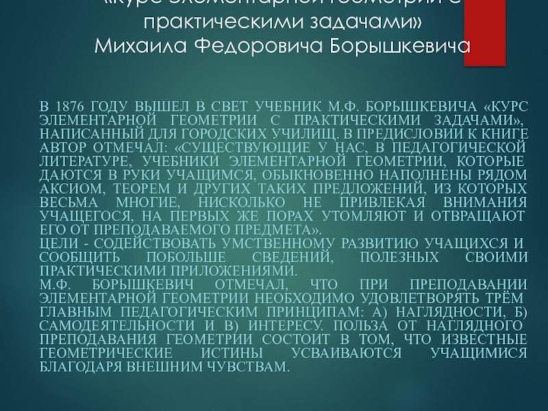 М.Ф. БОРЫШКЕВИЧ ОТМЕЧАЛ, ЧТО ПРИ ПРЕПОДАВАНИИ ЭЛЕМЕНТАРНОЙ ГЕОМЕТРИИ НЕОБХОДИМО УДОВЛЕТВОРЯТЬ ТРЁМ ГЛАВНЫМ ПЕДАГОГИЧЕСКИМ ПРИНЦИПАМ: А) НАГЛЯДНОСТИ, Б) САМОДЕЯТЕЛЬНОСТИ И В) ИНТЕРЕСУ. ПОЛЬЗА ОТ НАГЛЯДНОГО ПРЕПОДАВАНИЯ ГЕОМЕТРИИ СОСТОИТ В ТОМ, ЧТО ИЗВЕСТНЫЕ ГЕОМЕТРИЧЕСКИЕ ИСТИНЫ УСВАИВАЮТСЯ УЧАЩИМИСЯ БЛАГОДАРЯ ВНЕШНИМ ЧУВСТВАМ.