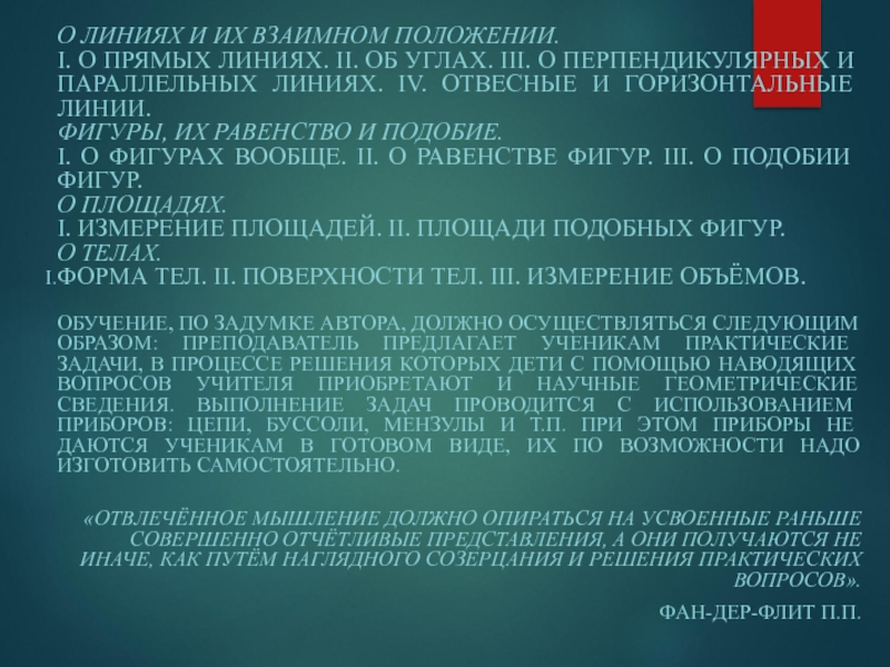 КУРС ГЕОМЕТРИИ» ВПЕРВЫЕ БЫЛ ПРЕДСТАВЛЕН В ЖУРНАЛЕ «УЧИТЕЛЬ», А ЗАТЕМ ОПУБЛИКОВАН САМОСТОЯТЕЛЬНОЙ КНИГОЙ В 1868 ГОДУ. ПЕРВОЕ ПОЛОЖЕНИЕ СФОРМУЛИРОВАННОЕ АВТОРОМ ГЛАСИТ О ТОМ, ЧТО НЕОБХОДИМО ЧЁТКО РАЗГРАНИЧИВАТЬ ГЕОМЕТРИЮ-НАУКУ И ГЕОМЕТРИЮ-УЧЕБНЫЙ ПРЕДМЕТ. «ТЕОРЕМЫ И ПОЛОЖЕНИЯ ЕЁ, ДАЖЕ САМЫЕ СЛОЖНЫЕ И ОТВЛЕЧЁННЫЕ, МОГУТ БЫТЬ ВЫВЕДЕНЫ ДВУМЯ НЕЗАВИСИМЫМИ ДРУГ ОТ ДРУГА СПОСОБАМИ: С ОДНОЙ СТОРОНЫ, ОНИ ВЫВОДЯТСЯ ЧИСТО ЛОГИЧЕСКИМ ПУТЁМ ИЗ ОСНОВНЫХ ПРЕДСТАВЛЕНИЙ ПРОСТРАНСТВА И ЧИСЛА ДА ИЗ НЕСКОЛЬКИХ ПРОСТЫХ АКСИОМ; С ДРУГОЙ СТОРОНЫ, ОНИ МОГУТ БЫТЬ НАЙДЕНЫ ИЗ НЕПОСРЕДСТВЕННОГО НАБЛЮДЕНИЯ И ОПЫТА, ХОТЯ ОБЫКНОВЕННО НАБЛЮДЕНИЕ И ОПЫТ СЛУЖАТ ТОЛЬКО ДЛЯ НАГЛЯДНОСТИ И ДЛЯ ПРОВЕРКИ РЕЗУЛЬТАТОВ, ПОЛУЧЕННЫХ ПУТЁМ ВЫВОДА». ВЫБРАННЫЙ ФАН-ДЕР-ФЛИТОМ, ЦЕНТРАЛЬНЫЙ МЕТОД ОБУЧЕНИЯ ГЕОМЕТРИИ ПРЕДСТАВЛЯЕТ СОБОЙ ИСПОЛЬЗОВАНИЕ НАВОДЯЩИХ ВОПРОСОВ. КУРС П.П. ФАН-ДЕР-ФЛИТА ПРЕДНАЗНАЧЕН ДЛЯ ДЕТЕЙ 10-ЛЕТНЕГО ВОЗРАСТА. ИЗЛОЖЕНИЕ МАТЕРИАЛА ПРЕДСТАВЛЕНО В ВИДЕ УРОКОВ, КОТОРЫЕ СОСТАВИЛИ ГЛАВЫ.