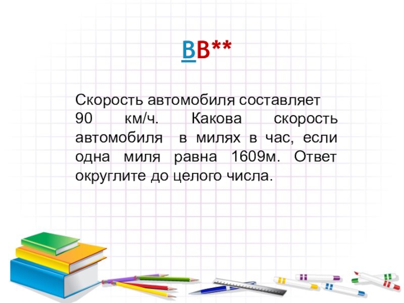 ВВ** Скорость автомобиля составляет 90 км/ч. Какова скорость автомобиля в милях в час, если одна миля равна