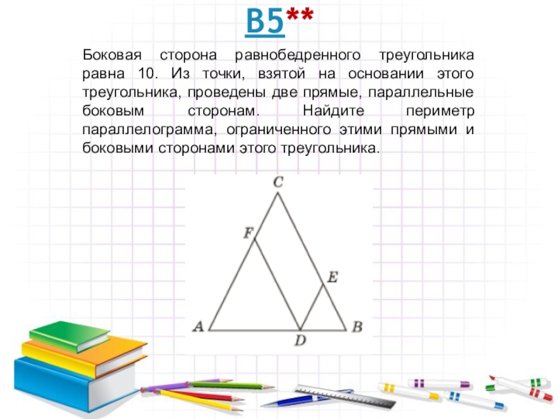 В5**Боковая сторона равнобедренного треугольника равна 10. Из точки, взятой на основании этого треугольника, проведены две прямые, параллельные