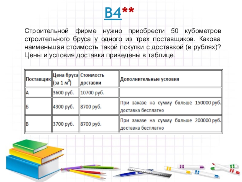 В4**Строительной фирме нужно приобрести 50 кубометров строительного бруса у одного из трех поставщиков. Какова наименьшая стоимость такой