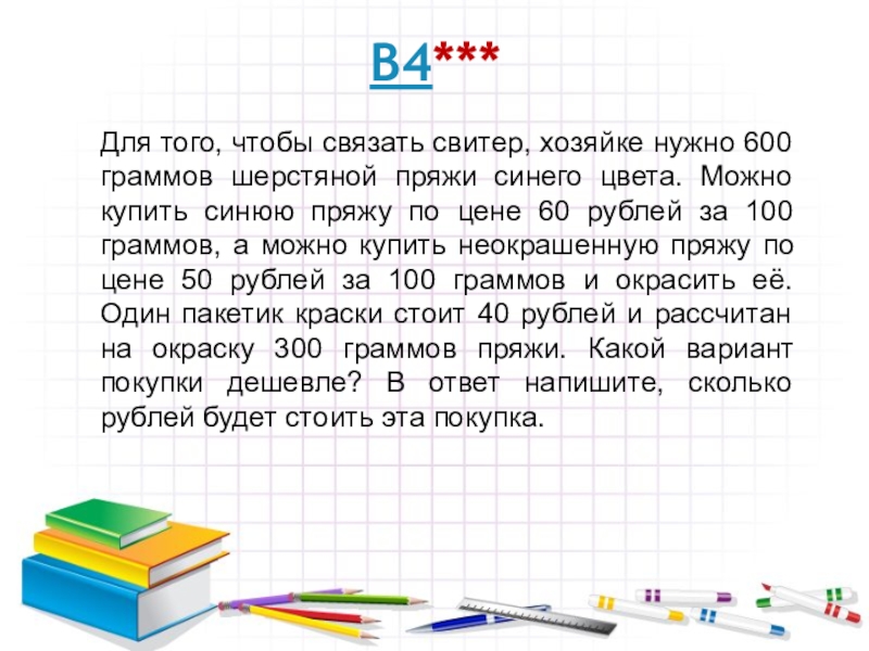 В4***Для того, чтобы связать свитер, хозяйке нужно 600 граммов шерстяной пряжи синего цвета. Можно купить синюю пряжу