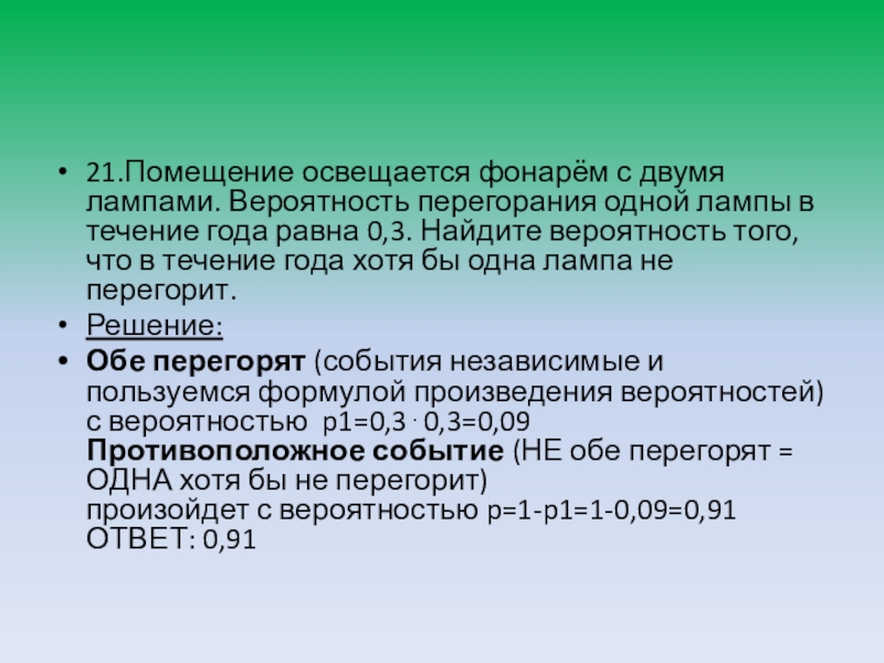 21.Помещение освещается фонарём с двумя лампами. Вероятность перегорания одной лампы в