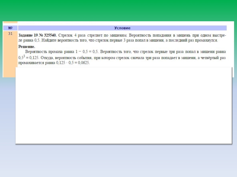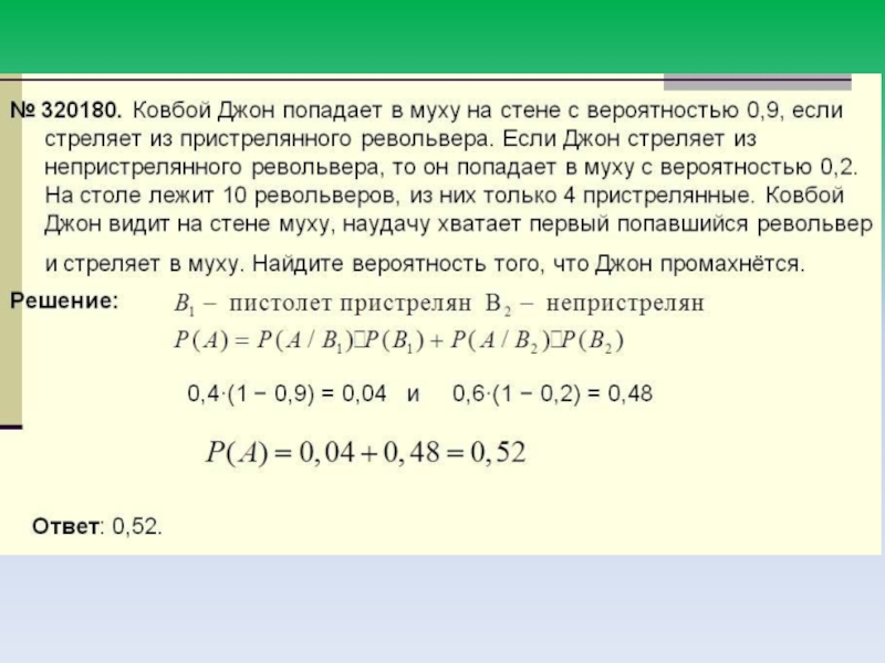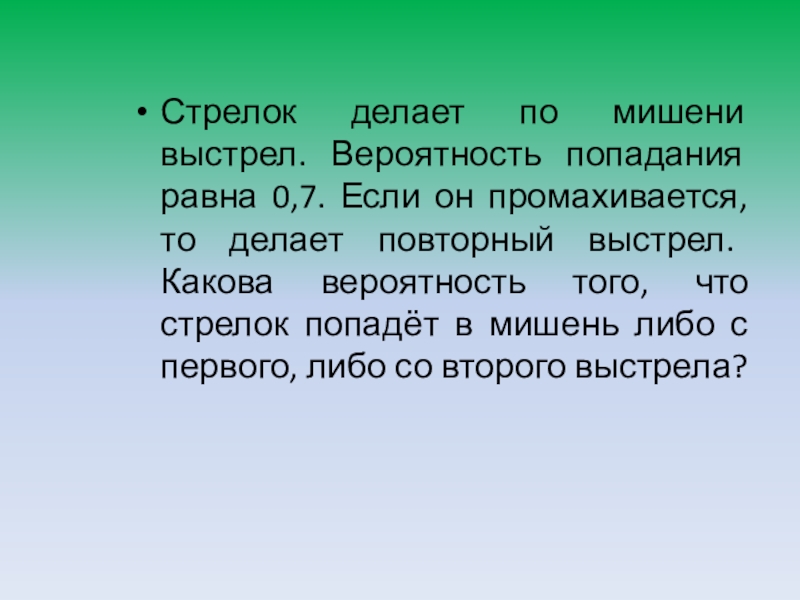 Слайд 38Стрелок делает по мишени выстрел. Вероятность попадания равна 0,7. Если он