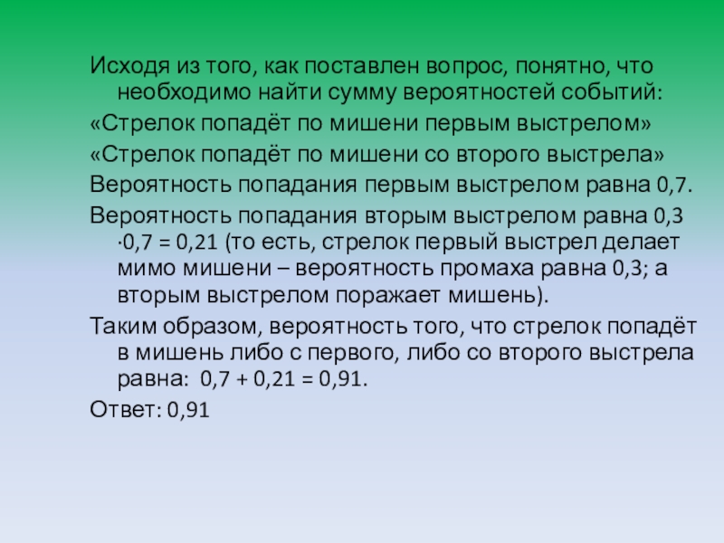 Таким образом, вероятность того, что стрелок попадёт в мишень либо с первого, либо со второго выстрела равна: 0,7 + 0,21 = 0,91.