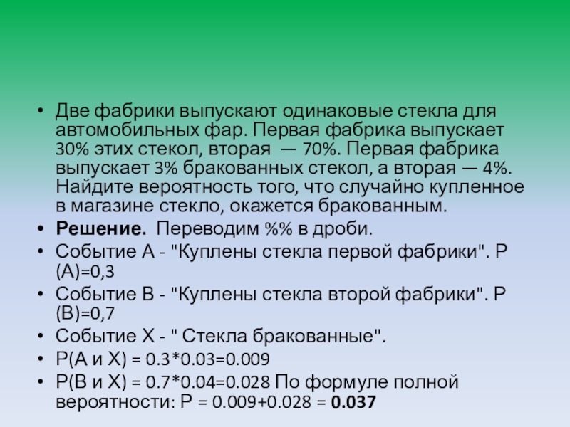 30% этих стекол, вторая — 70%. Первая фабрика выпускает 3% бракованных стекол, а вторая — 4%. Найдите вероятность того, что случайно купленное в магазине стекло, окажется бракованным.