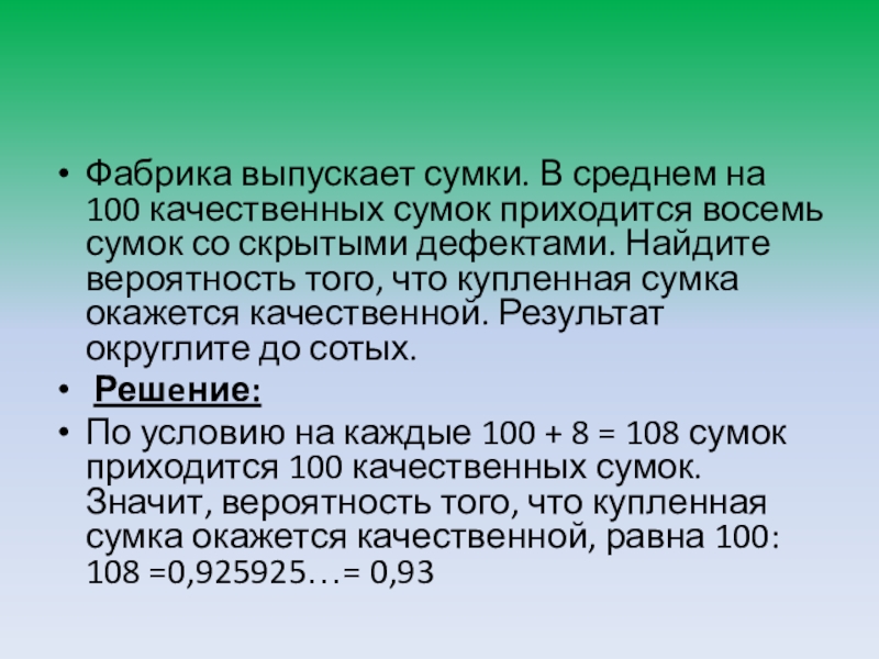 По условию на каждые 100 + 8 = 108 сумок приходится 100 качественных сумок. Значит, вероятность того, что купленная сумка окажется качественной, равна 100: 108 =0,925925…= 0,93