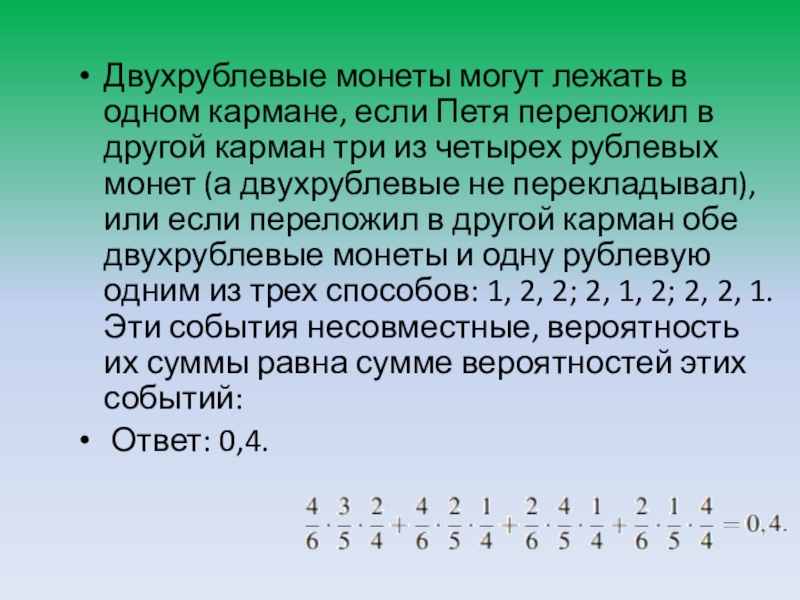 другой карман три из четырех рублевых монет (а двухрублевые не перекладывал), или если переложил в другой карман обе двухрублевые монеты и одну рублевую одним из трех способов: 1, 2, 2; 2, 1, 2; 2, 2, 1. Эти события несовместные, вероятность их суммы равна сумме вероятностей этих событий: