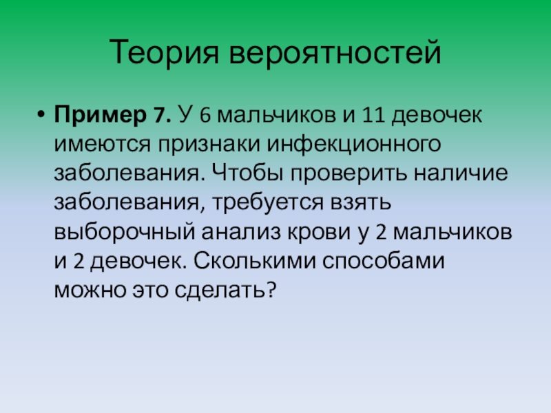 заболевания. Чтобы проверить наличие заболевания, требуется взять выборочный анализ крови у 2 мальчиков и 2 девочек. Сколькими способами можно это сделать?