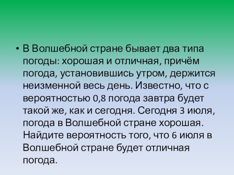 погода, установившись утром, держится неизменной весь день. Известно, что с вероятностью 0,8 погода завтра будет такой же, как и сегодня. Сегодня 3 июля, погода в Волшебной стране хорошая. Найдите вероятность того, что 6 июля в Волшебной стране будет отличная погода.