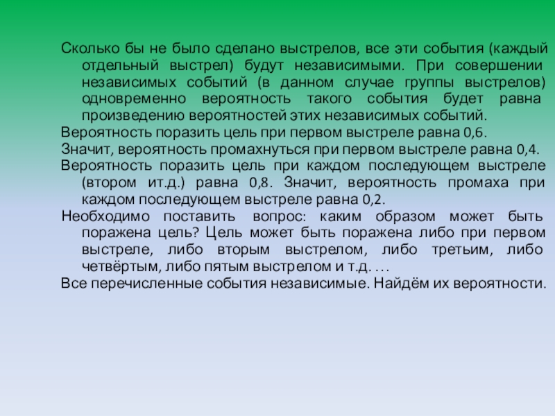 Необходимо поставить вопрос: каким образом может быть поражена цель? Цель может быть поражена либо при первом выстреле, либо вторым выстрелом, либо третьим, либо четвёртым, либо пятым выстрелом и т.д. …