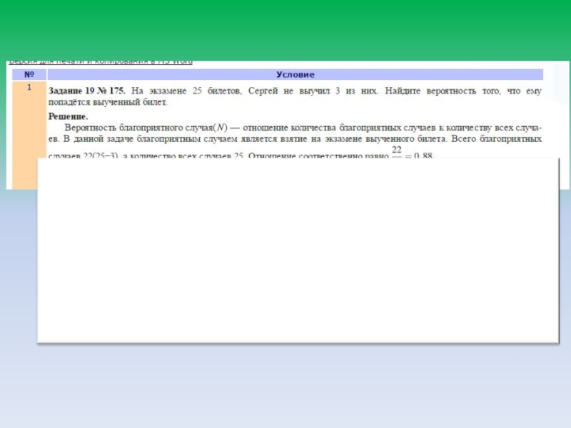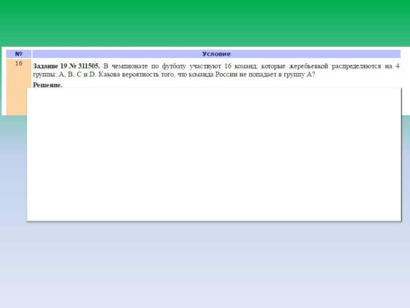 Решeние: За первые три дня будет прочитан 51 доклад, на последние два дня планируется 24 доклада. Поэтому на последний день запланировано 12 докладов. Значит, вероятность того, что доклад профессора М. окажется запланированным на последний день конференции, равна 12 : 75 =0,16