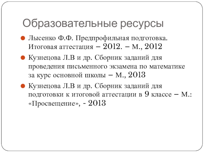 Кузнецова Л.В и др. Сборник заданий для подготовки к итоговой аттестации в 9 классе – М.: «Просвещение», - 2013