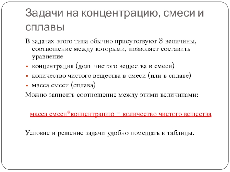 Слайд 7Задачи на концентрацию, смеси и сплавы