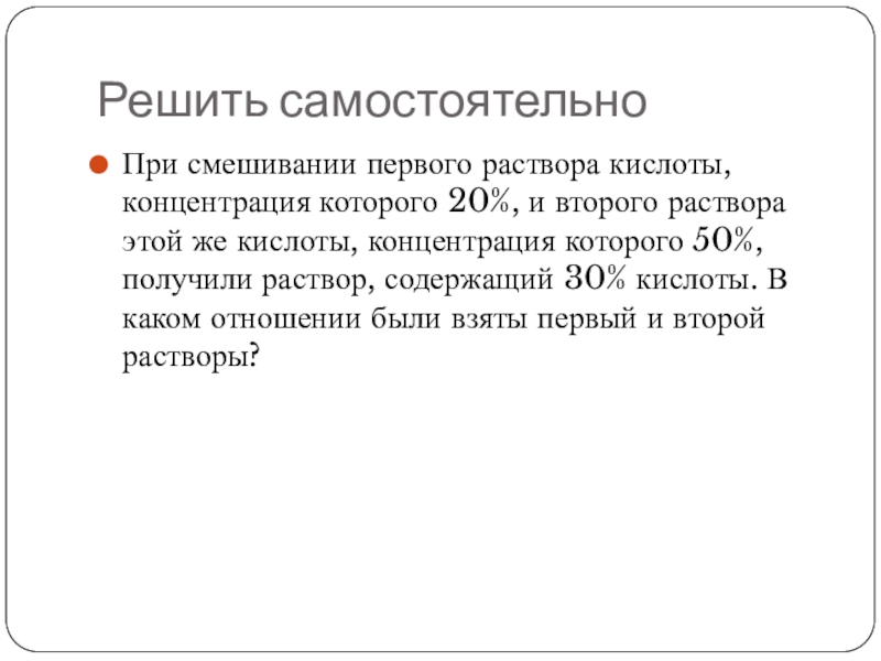 раствора этой же кислоты, концентрация которого 50%, получили раствор, содержащий 30% кислоты. В каком отношении были взяты первый и второй растворы?