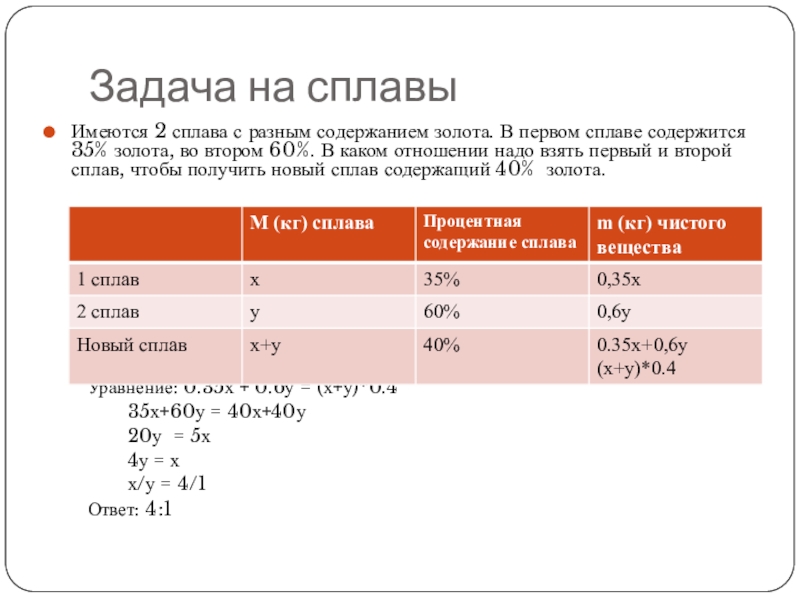 Уравнение: 0.35х + 0.6у = (х+у)*0.4