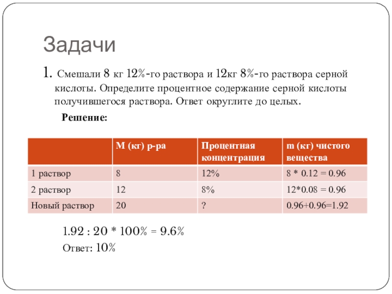 1. Смешали 8 кг 12%-го раствора и 12кг 8%-го раствора серной
