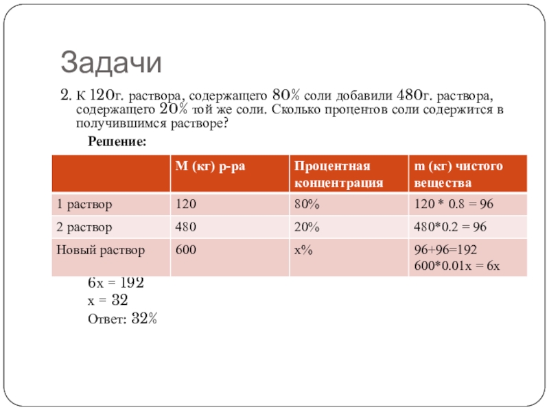 2. К 120г. раствора, содержащего 80% соли добавили 480г. раствора, содержащего