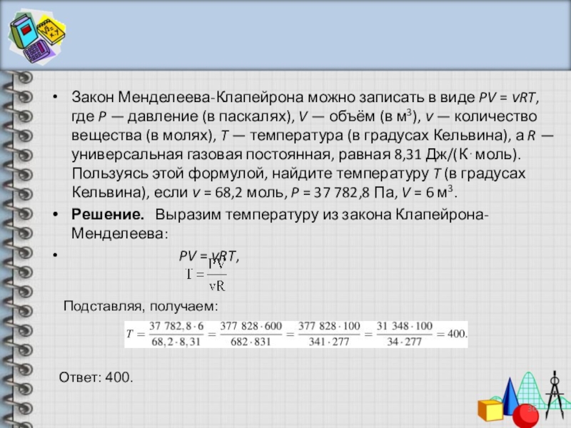 (в м3), ν — количество вещества (в молях), T — температура (в градусах Кельвина), а R — универсальная газовая постоянная, равная 8,31 Дж/(К⋅моль). Пользуясь этой формулой, найдите температуру T (в градусах Кельвина), если ν = 68,2 моль, P = 37 782,8 Па, V = 6 м3.
