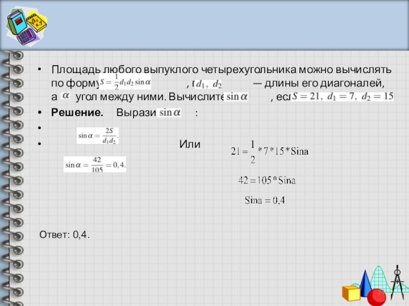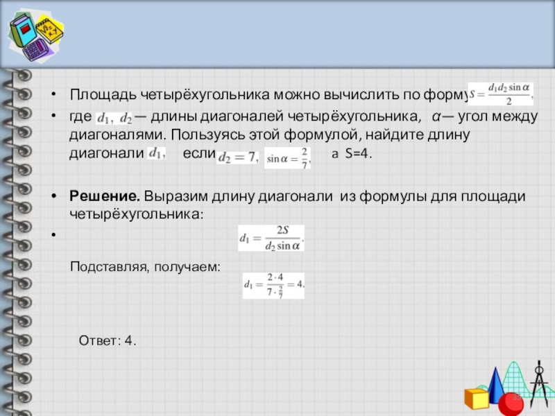 диагоналей четырёхугольника, α— угол между диагоналями. Пользуясь этой формулой, найдите длину диагонали