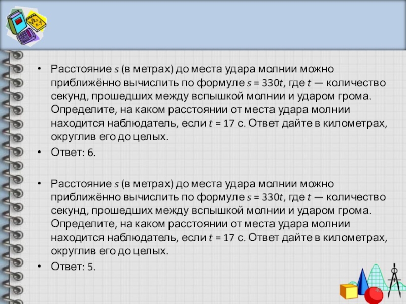 Слайд 7Расстояние s (в метрах) до места удара молнии можно приближённо вычислить по формуле s = 330t,