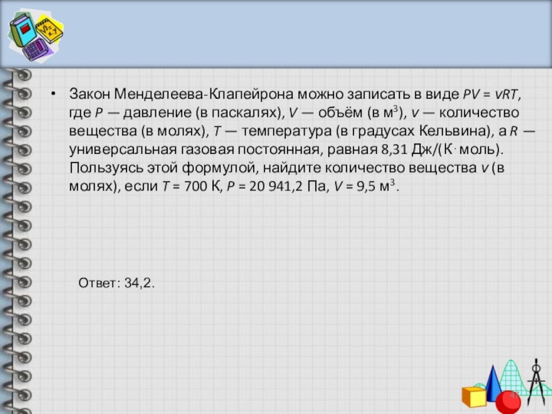 (в м3), ν — количество вещества (в молях), T — температура (в градусах Кельвина), а R — универсальная газовая постоянная, равная 8,31 Дж/(К⋅моль). Пользуясь этой формулой, найдите количество вещества ν (в молях), если T = 700 К, P = 20 941,2 Па, V = 9,5 м3.