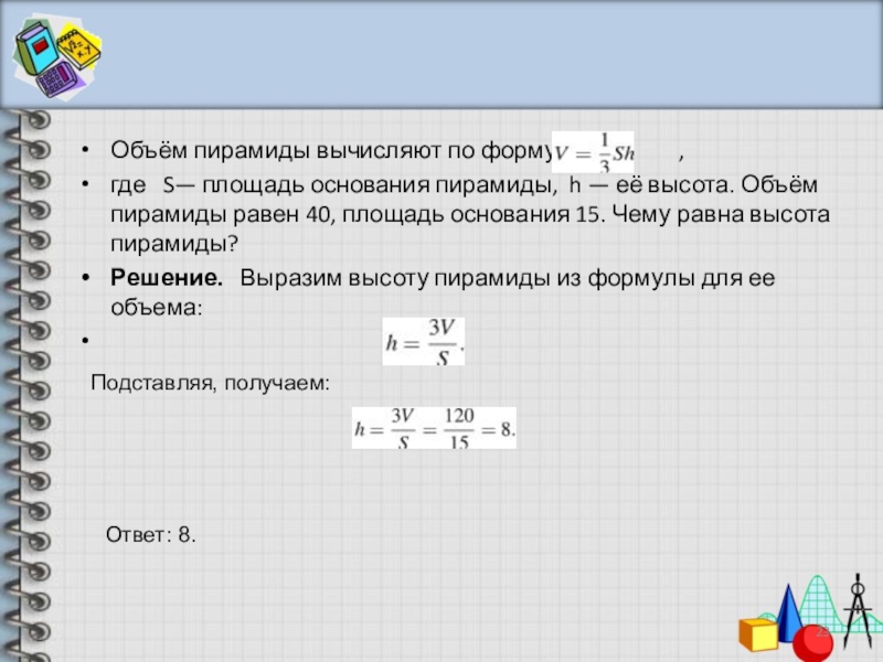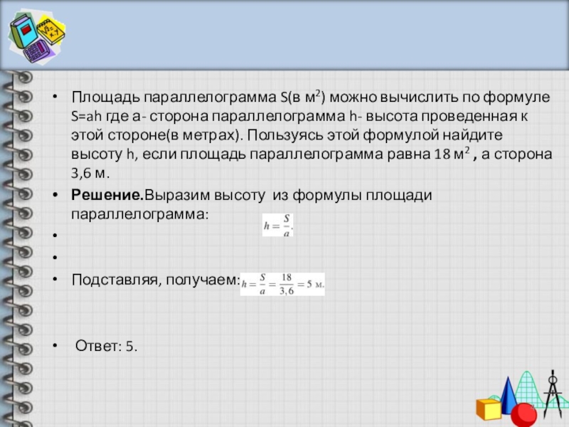 сторона параллелограмма h- высота проведенная к этой стороне(в метрах). Пользуясь этой формулой найдите высоту h, если площадь параллелограмма равна 18 м2 , а сторона 3,6 м.