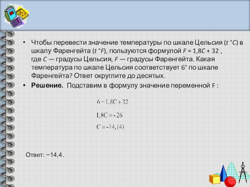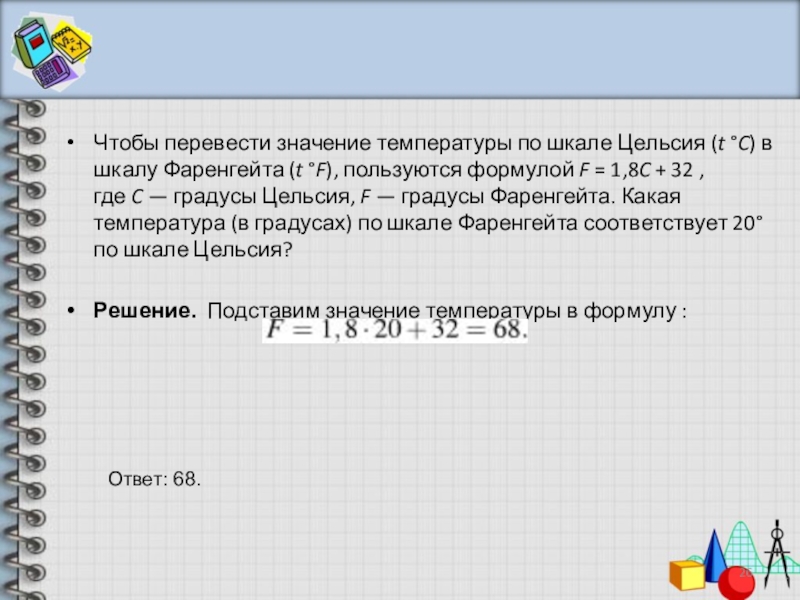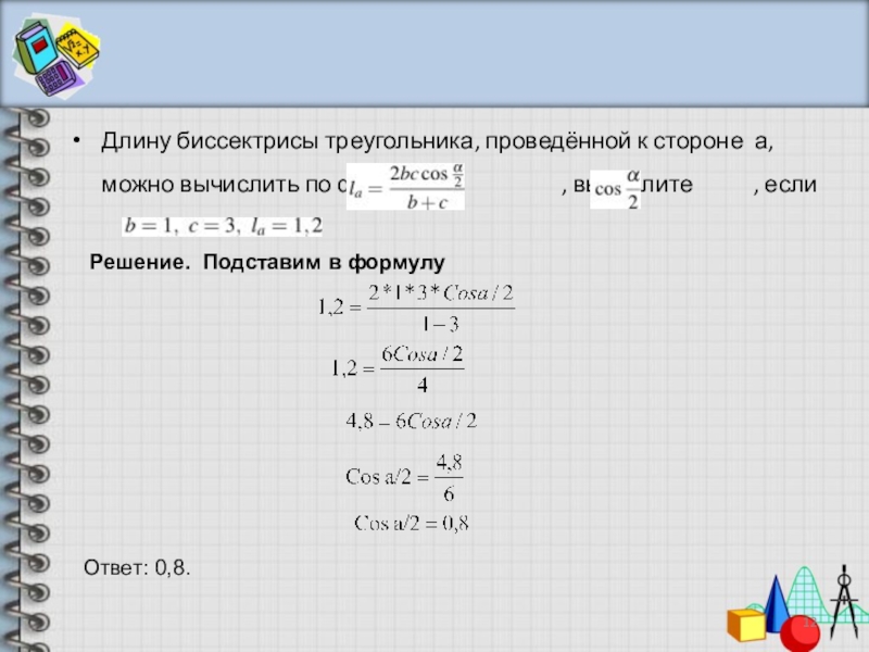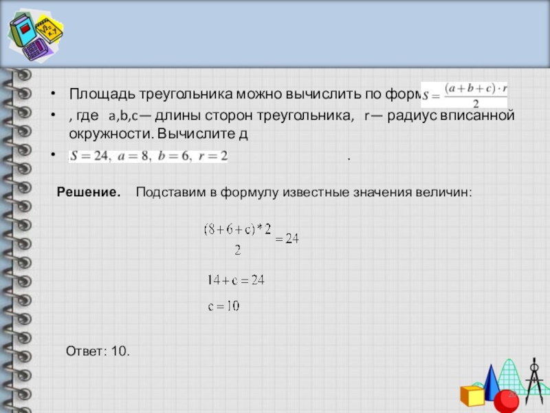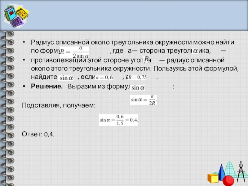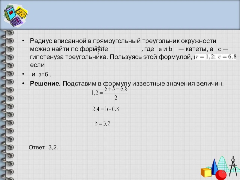 Решение. Выразим радиус окружности: Подставим значения переменных a и