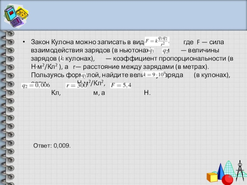 где F — сила взаимодействия зарядов (в ньютонах), и — величины зарядов (в кулонах), — коэффициент пропорциональности (в Н·м2/Кл2 ), а r— расстояние между зарядами (в метрах). Пользуясь формулой, найдите величину заряда (в кулонах), если Н·м2/Кл2,