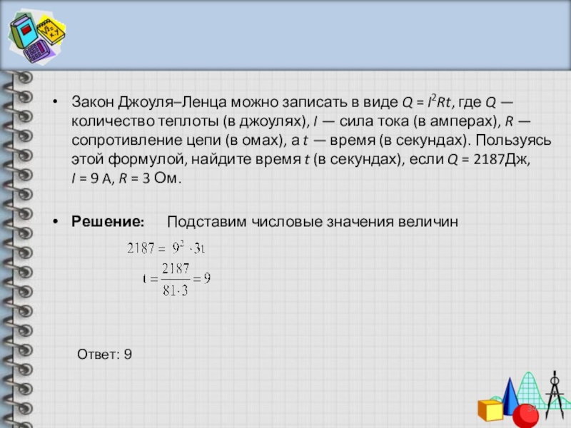 сила тока (в амперах), R — сопротивление цепи (в омах), а t — время (в секундах). Пользуясь этой формулой, найдите время t (в секундах), если Q = 2187Дж, I = 9 A, R = 3 Ом.