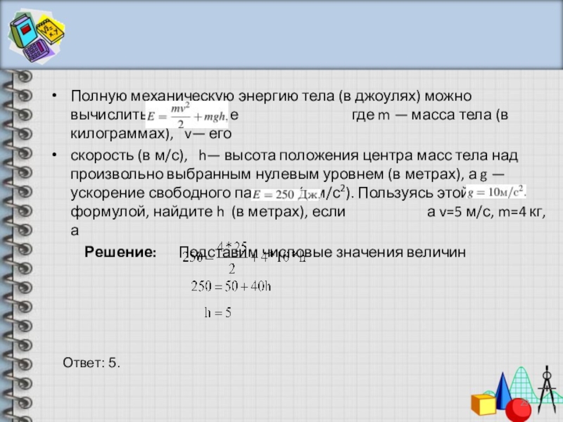 скорость (в м/с), h— высота положения центра масс тела над произвольно выбранным нулевым уровнем (в метрах), а g — ускорение свободного падения (в м/с2). Пользуясь этой формулой, найдите h (в метрах), если а v=5 м/с, m=4 кг, а