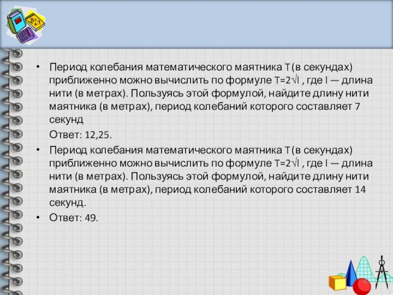 T=2√l , где l — длина нити (в метрах). Пользуясь этой формулой, найдите длину нити маятника (в метрах), период колебаний которого составляет 7 секунд