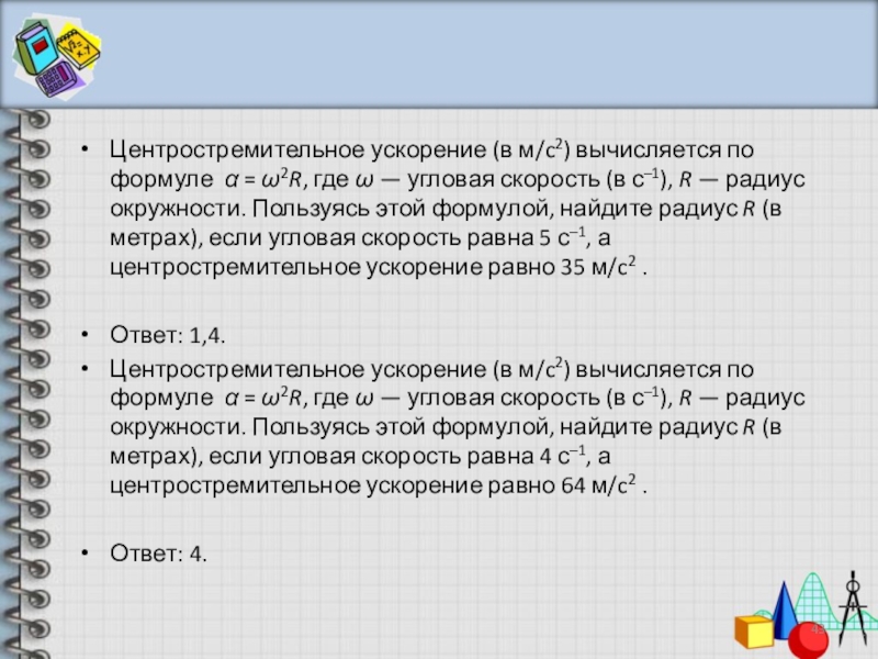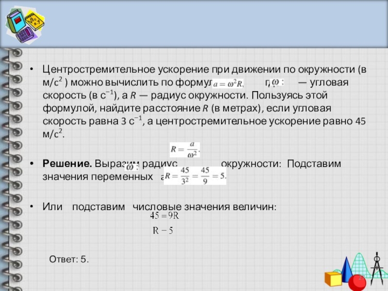 формуле где — угловая скорость (в с−1), а R — радиус окружности. Пользуясь этой формулой, найдите расстояние R (в метрах), если угловая скорость равна 3 с−1, а центростремительное ускорение равно 45 м/c2.